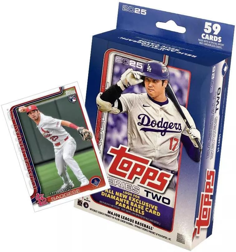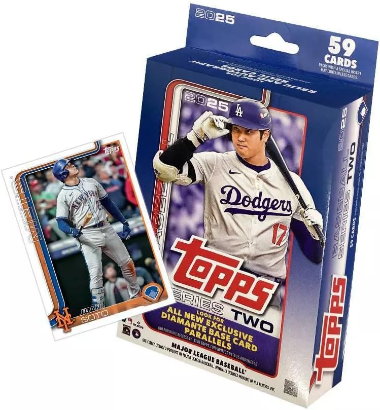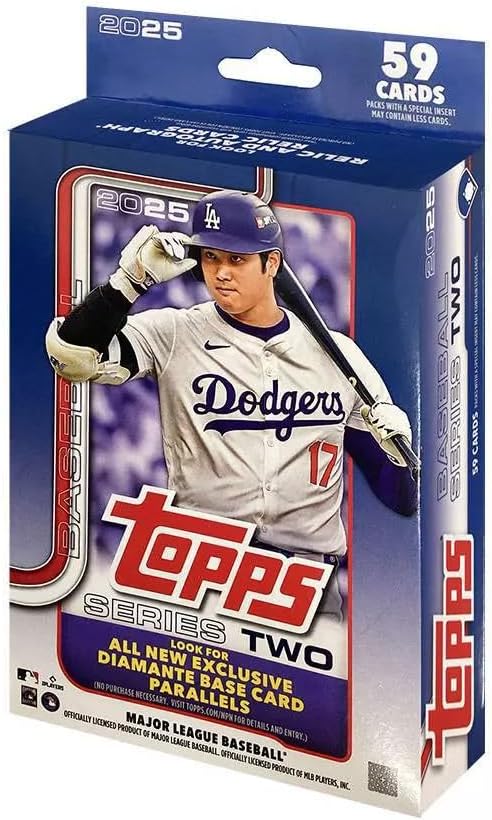 Topps presents the 2025 MLB Series Two Baseball Trading Card Hanger Box. Each box contains 59 cards (Packs with a Special Insert May Contain Less Cards). Look for All New Exclusive Diamante Base Card Parallels. Look for Relic and Autograph Relic Cards. Content may vary.