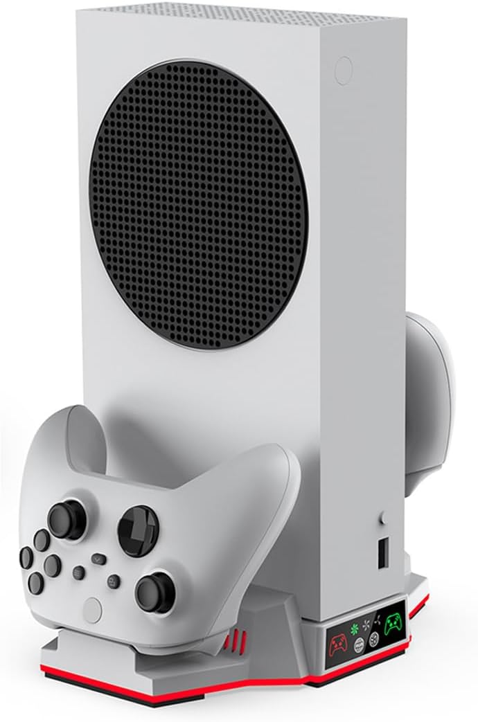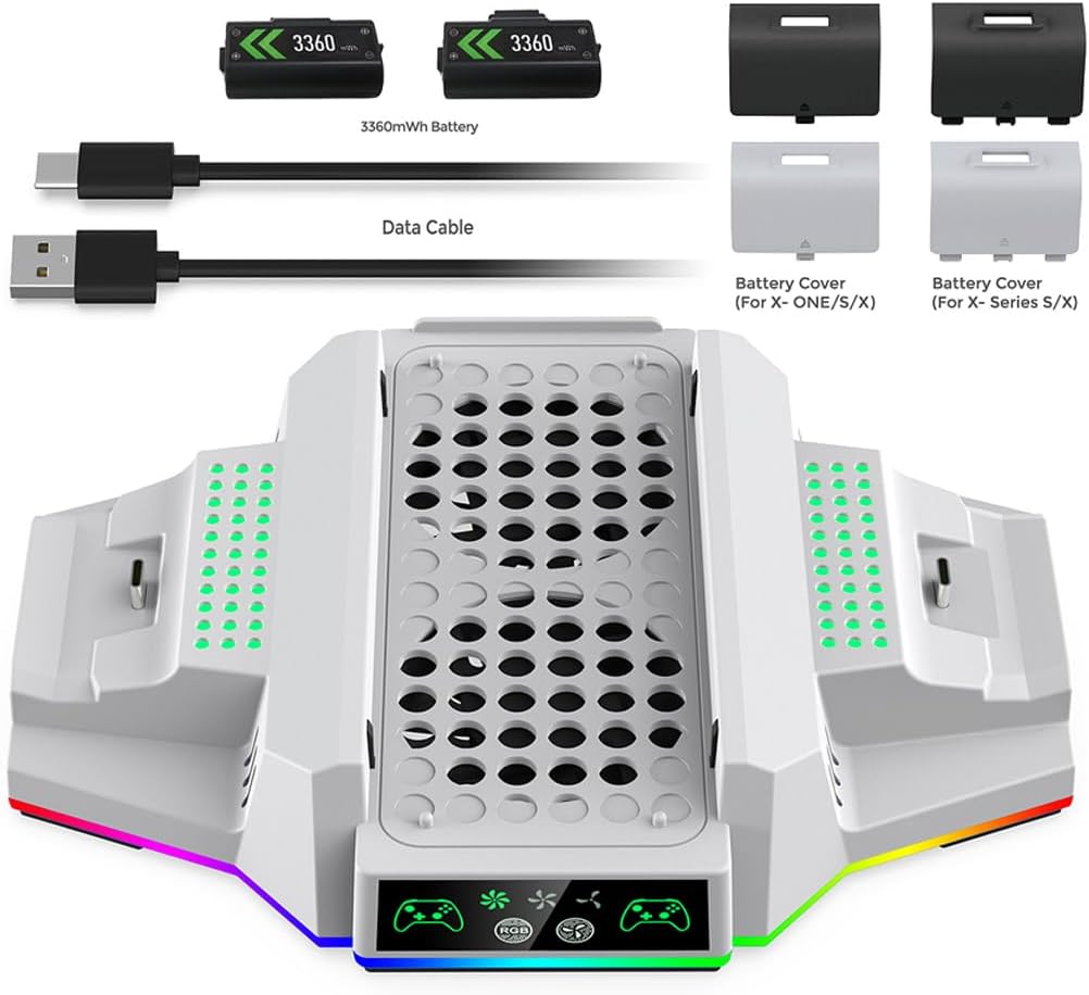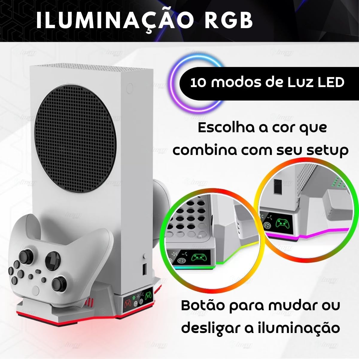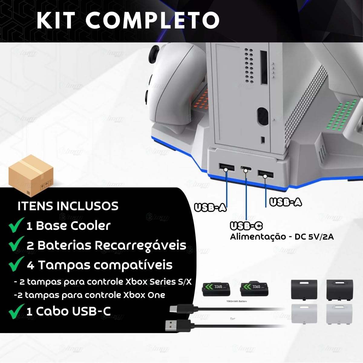 Base Cooler Luz Led RGB com Carregador para Xbox Series S OBS.: BASE COOLER COMPATÍVEL APENAS COM XBOX SERIES S Com design compacto e estiloso a base cooler foi projetado para atender a diversas necessidades e proporcionar conforto, conveniência e organização enquanto joga. – Projetado exclusivamente para o Xbox Series S, com uma base mais elevada aumenta o espaço de resfriamento, dissipando o calor de forma mais eficiente, com 2 ventiladores embutidos com até 3 velocidades diferentes podem rapidamente resfriar o console prolongando sua vida útil. – Com luz led em toda volta da base e com botão para mudar e escolher a cor que mais combina com seu estilo. – Dois docks de carregamento na base, podendo carregar 2 controles simultaneamente com indicador led de carga: A luz verde para totalmente -carregador. Luz vermelha enquanto estiver carregando. – Vem incluso nesse kit 2 baterias para Xbox e 4 tampas, sendo elas: 2 tampas para Xbox Series S/X e 2 tampas para Xbox One. ESPECIFICAÇÕES TÉCNICAS: – Voltagem: DC 5V/2A – Ventoinhas: 2 – Velocidade: 3 – Estação de carregamento. Carregue 2 controles simultaneamente. – 10 Opções de modos de luz LED da base. Ou segure botão para desligar a luz led. – Indicador de status de carregamento. – Material: ABS – Pezinhos antiderrapante – Alimentação: USB Tipo C – Cores disponíveis: Branco e Preto – Compatível com Xbox Series S Itens inclusos: – 1 Suporte Cooler para Xbox Series S – 2 baterias brancas recarregáveis – 1 Tampa branca compatíveis com controles Xbox Series S/X – 1 Tampa branca compatíveis com controles Xbox One – 1 Tampa preta compatíveis com controles Xbox Series S/X – 1 Tampa preta compatíveis com controles Xbox One – 1 Cabo Usb C