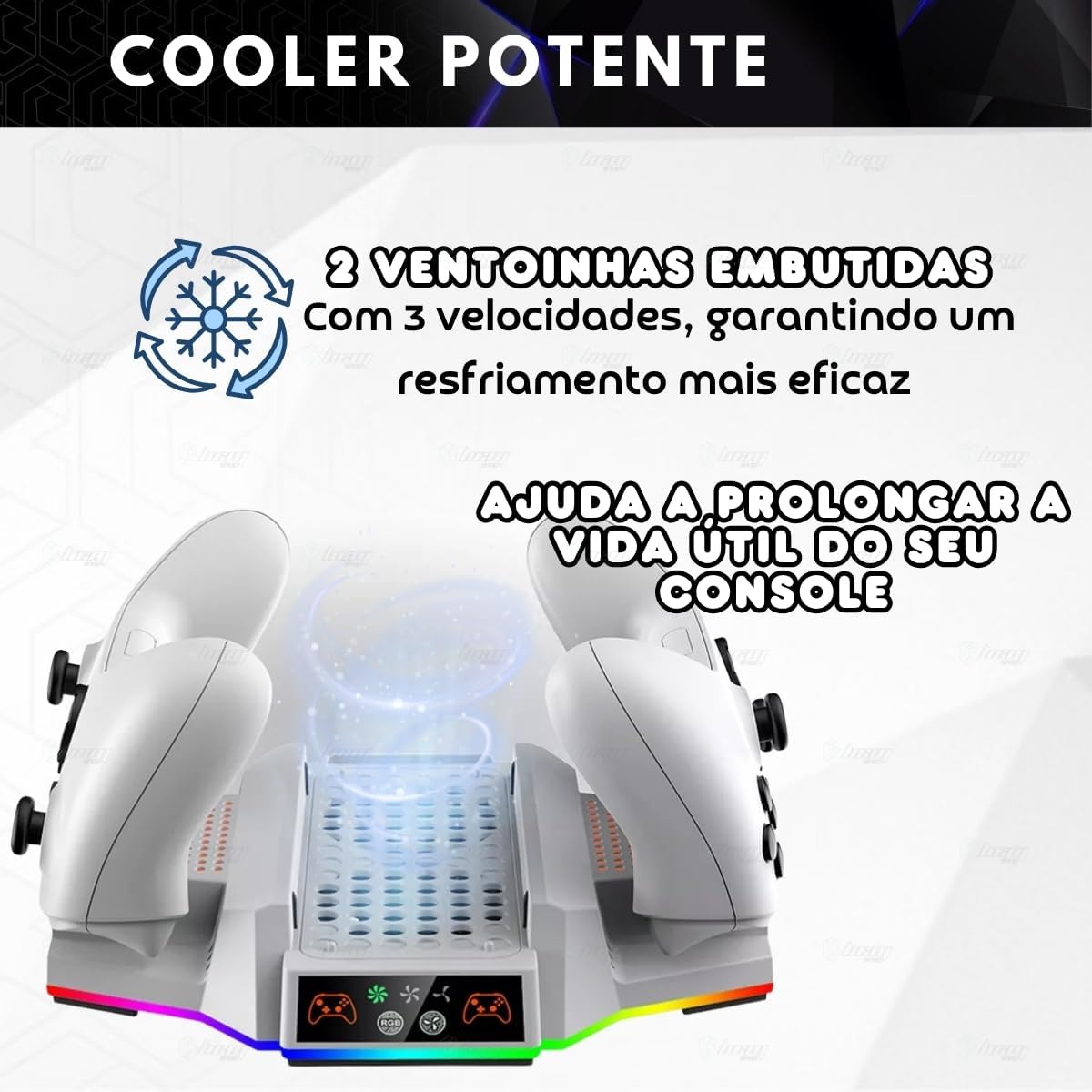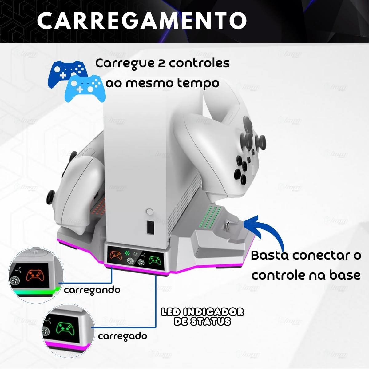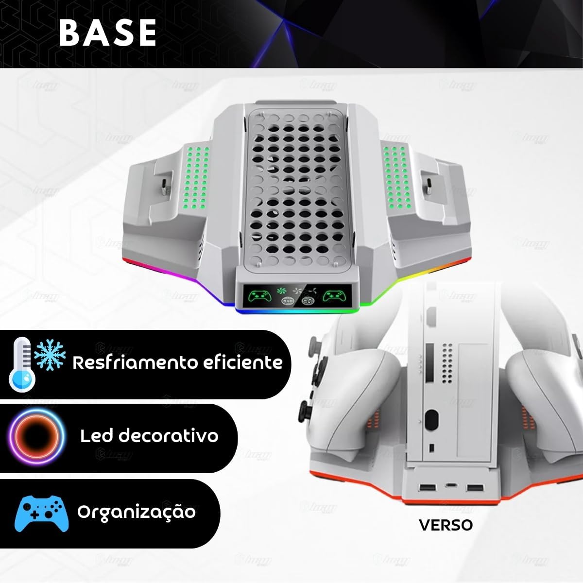 Base Cooler Luz Led RGB com Carregador para Xbox Series S OBS.: BASE COOLER COMPATÍVEL APENAS COM XBOX SERIES S Com design compacto e estiloso a base cooler foi projetado para atender a diversas necessidades e proporcionar conforto, conveniência e organização enquanto joga. – Projetado exclusivamente para o Xbox Series S, com uma base mais elevada aumenta o espaço de resfriamento, dissipando o calor de forma mais eficiente, com 2 ventiladores embutidos com até 3 velocidades diferentes podem rapidamente resfriar o console prolongando sua vida útil. – Com luz led em toda volta da base e com botão para mudar e escolher a cor que mais combina com seu estilo. – Dois docks de carregamento na base, podendo carregar 2 controles simultaneamente com indicador led de carga: A luz verde para totalmente -carregador. Luz vermelha enquanto estiver carregando. – Vem incluso nesse kit 2 baterias para Xbox e 4 tampas, sendo elas: 2 tampas para Xbox Series S/X e 2 tampas para Xbox One. ESPECIFICAÇÕES TÉCNICAS: – Voltagem: DC 5V/2A – Ventoinhas: 2 – Velocidade: 3 – Estação de carregamento. Carregue 2 controles simultaneamente. – 10 Opções de modos de luz LED da base. Ou segure botão para desligar a luz led. – Indicador de status de carregamento. – Material: ABS – Pezinhos antiderrapante – Alimentação: USB Tipo C – Cores disponíveis: Branco e Preto – Compatível com Xbox Series S Itens inclusos: – 1 Suporte Cooler para Xbox Series S – 2 baterias brancas recarregáveis – 1 Tampa branca compatíveis com controles Xbox Series S/X – 1 Tampa branca compatíveis com controles Xbox One – 1 Tampa preta compatíveis com controles Xbox Series S/X – 1 Tampa preta compatíveis com controles Xbox One – 1 Cabo Usb C