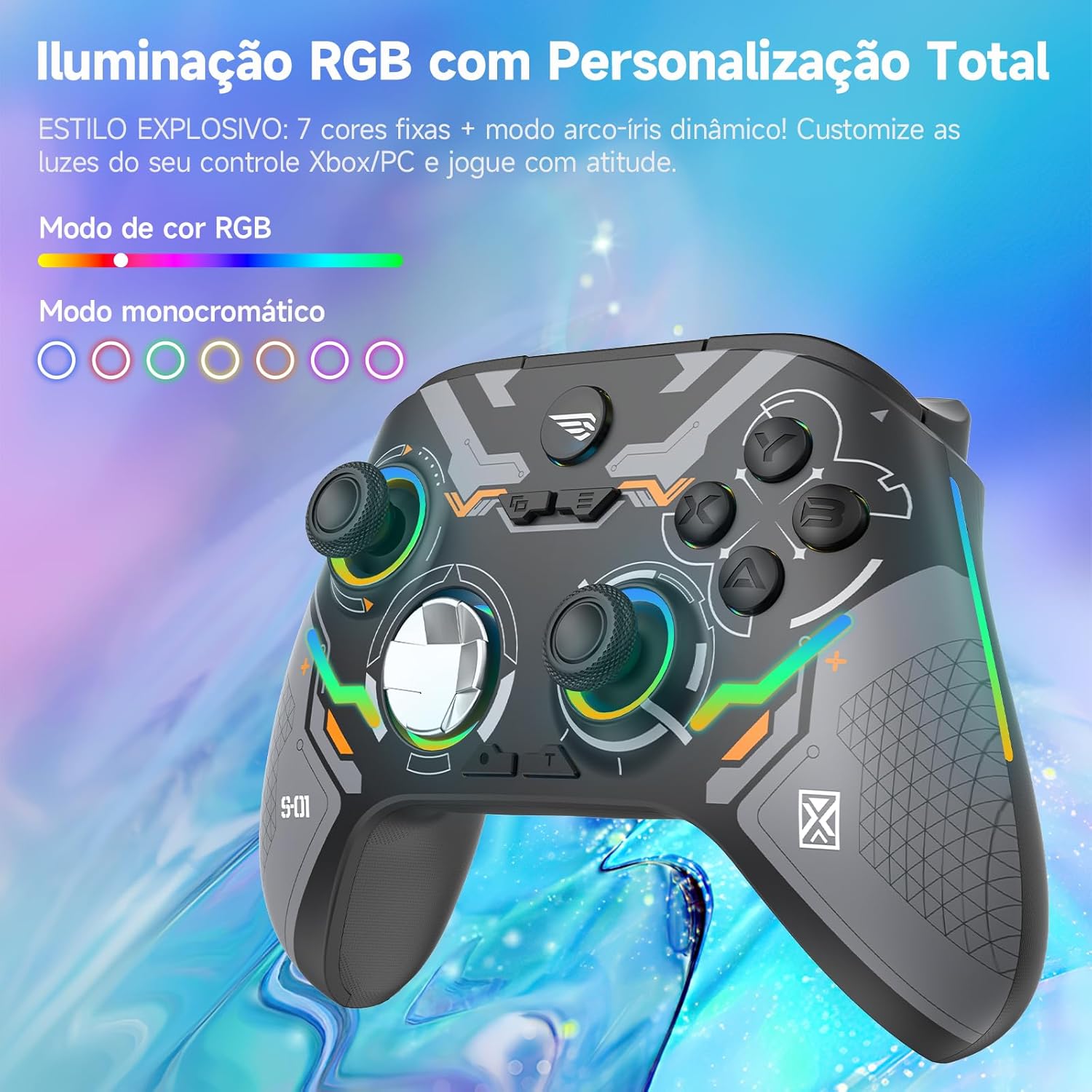 Iluminação RGB Personalizável: Escolha entre 7 cores fixas (branco, amarelo, verde, azul, ciano, roxo, vermelho) ou modo de arco-íris dinâmico. Adicione estilo ao seu controle xbox ou gamepad com luzes vibrantes!