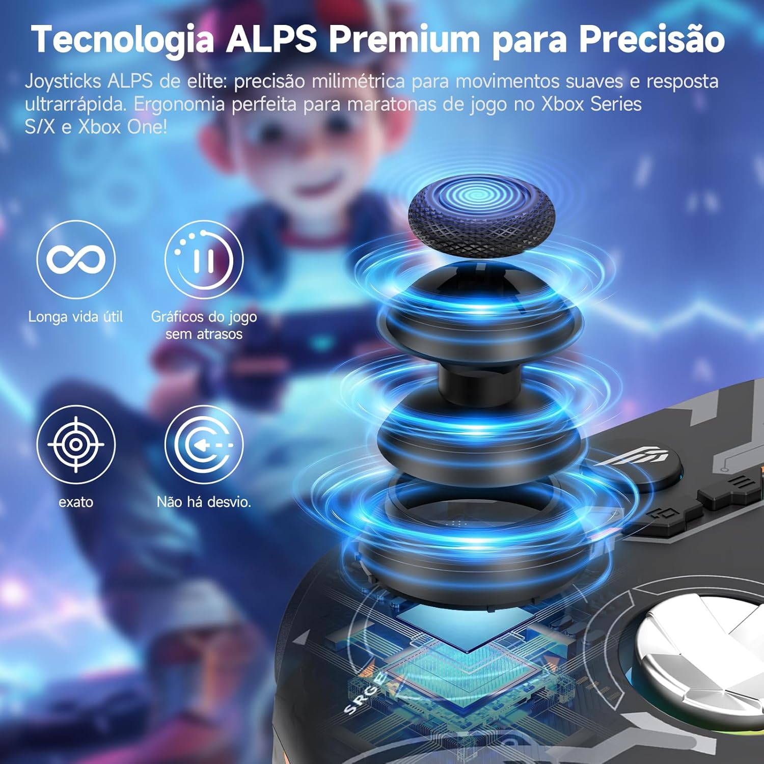 Tecnologia ALPS Premium para Precisão: Analógicos com sensores ALPS específicos para jogos, garantindo movimentos suaves e resposta rápida. Ideal para controle xbox series s e controle xbox one, com ergonomia perfeita para sessões longas.