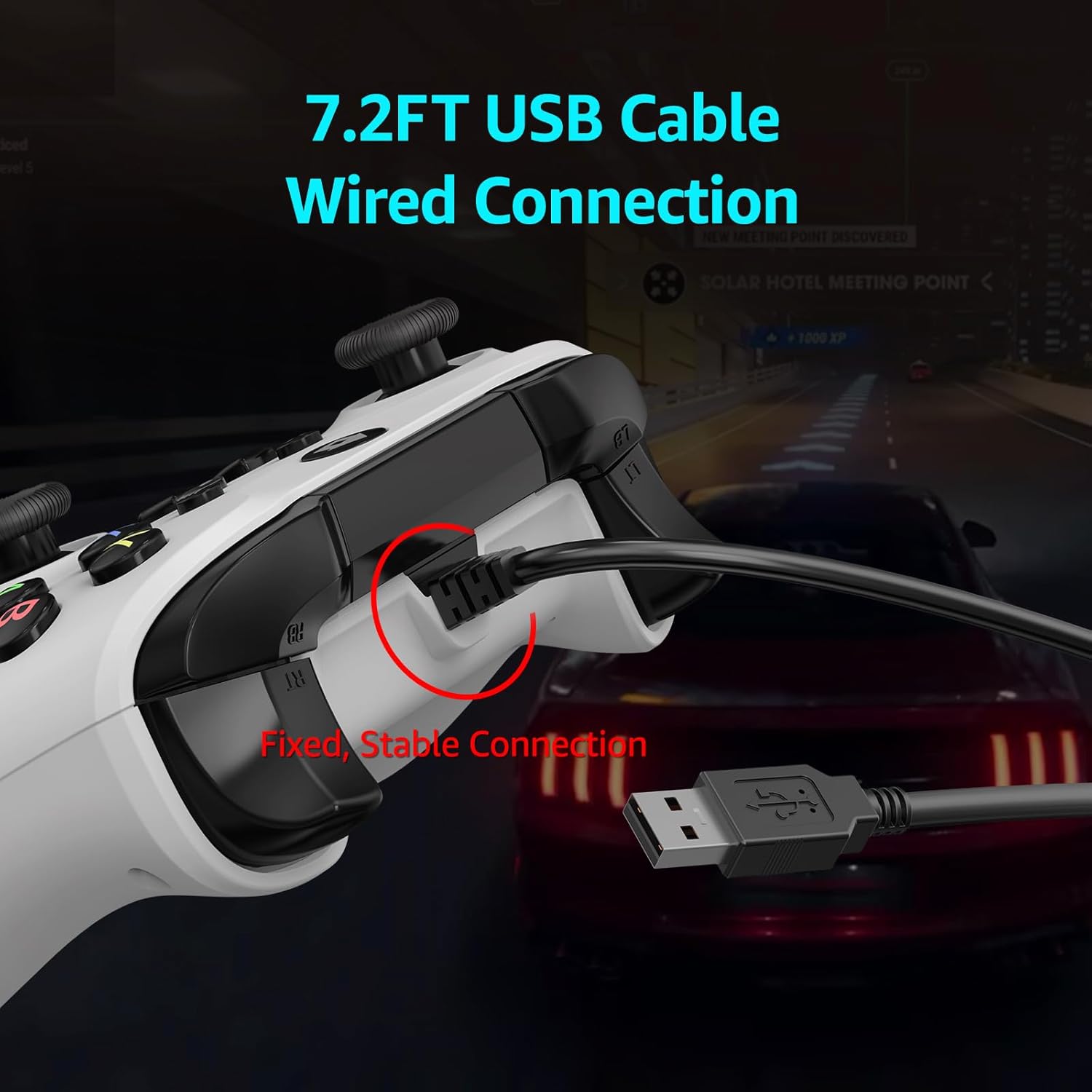 【Fixed USB Wired Controller】The controller features a fixed USB connection, with a built-in 7.2FT cable that plugs directly into the console, ensuring reliable performance without the need for pairing or charging.