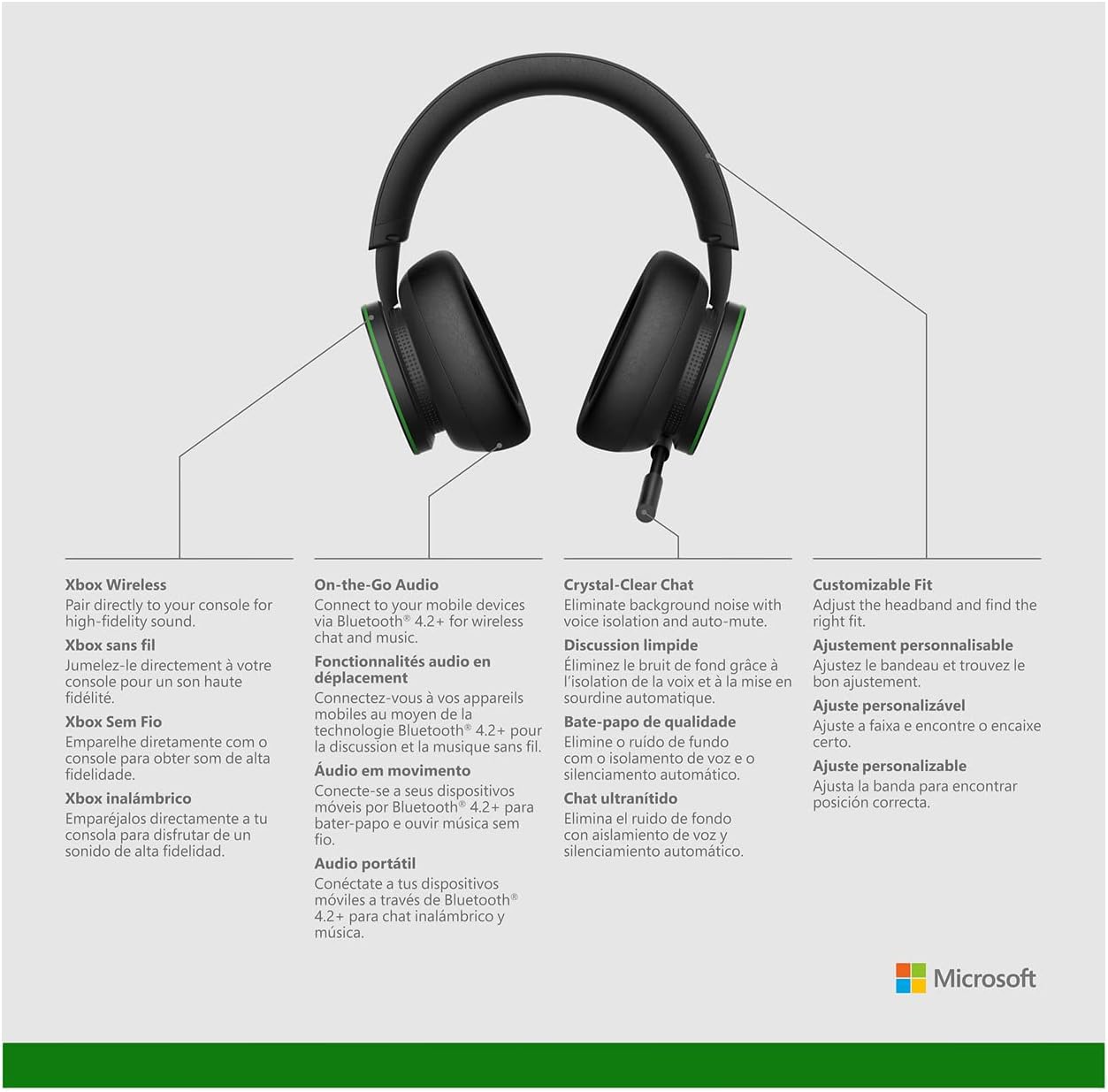 Jogue com o som alto e claro com o fone de ouvido sem fio Xbox, envolva-se com tecnologias de som espacial, incluindo Windows Sonic, Dolby Atmos e DTS Headphone: X. O auto-mute e o isolamento de voz reduzem o ruído de fundo e permitem uma comunicação clara. O design flexível e leve com uma faixa de cabeça ajustável proporciona uma experiência mais confortável durante sessões de jogo prolongadas, enquanto os botões giratórios do fone de ouvido fornecem uma maneira rápida e intuitiva de ajustar o volume e o equilíbrio do jogo / chat. Ajuste seu fone de ouvido com o aplicativo Acessórios Xbox para uma experiência de áudio personalizada. Emparelhe diretamente com seu console com o Xbox Wireless radio sem a necessidade de dongles, cabos ou uma estação base e conecte-se ao seu dispositivo móvel com Bluetooth®️ para música ou conversar em movimento. Você até pode emparelhar o seu telefone com o Xbox simultaneamente, para conversar com um amigo no telefone enquanto você joga no console.