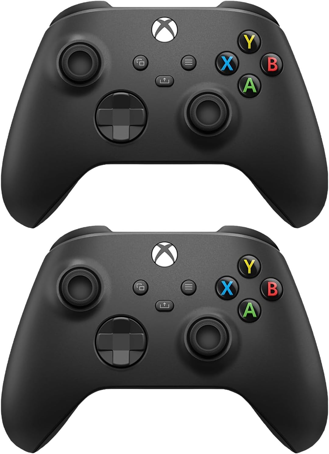 Bundle includes: 2x Microsoft Xbox Core Wireless Gaming Controllers in Carbon Black, Microsoft Warranty