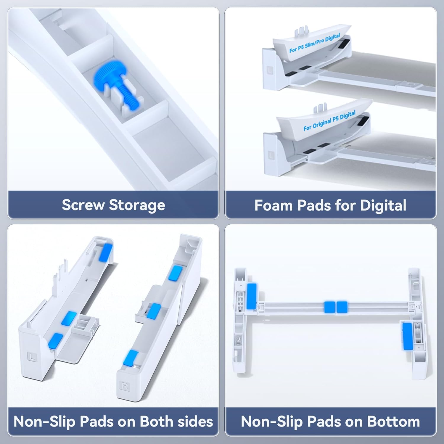 [ Scalable Stand Fits PS5/ PS5 Slim/ PS5 Pro Versions] The PS5 side stand is compatible with both PS5/Slim/Pro Digital Edition & Disc Edition Consoles (EVA foam for PS5 Digital), by stretching and shrinking the left and right stands,and according to the type on the stand to install the designated slot, then secure your ps5 console on PS5 slim stand with fixed crew.