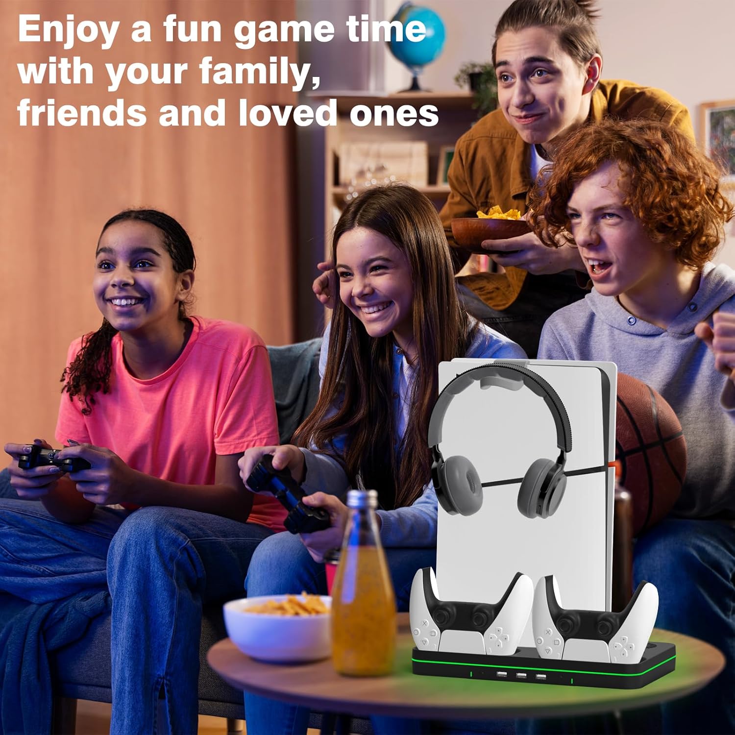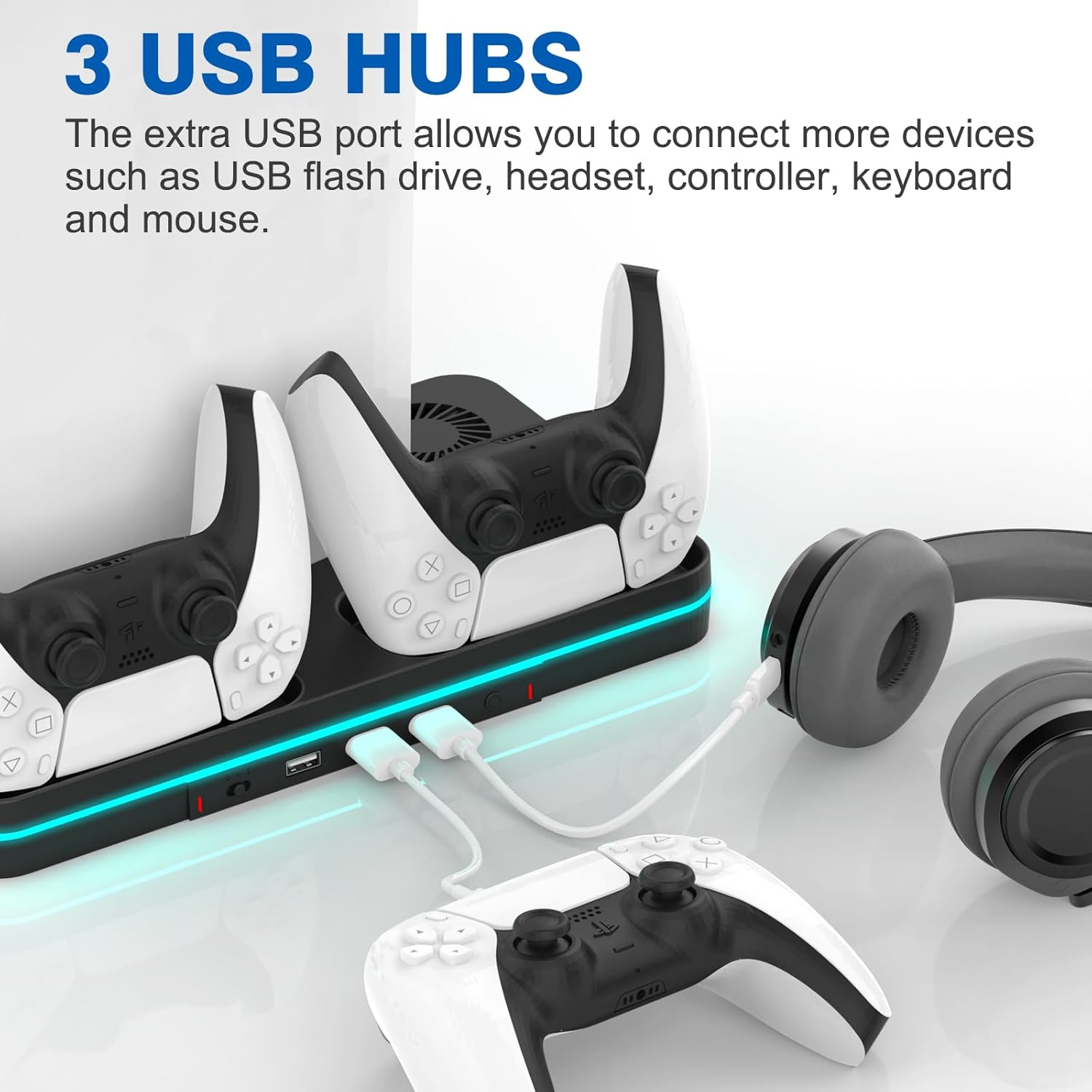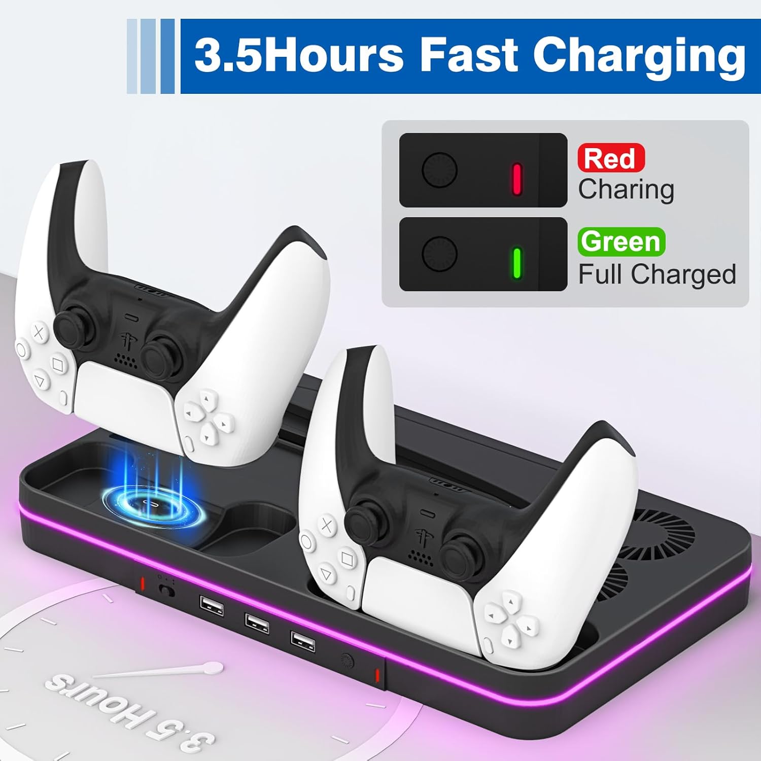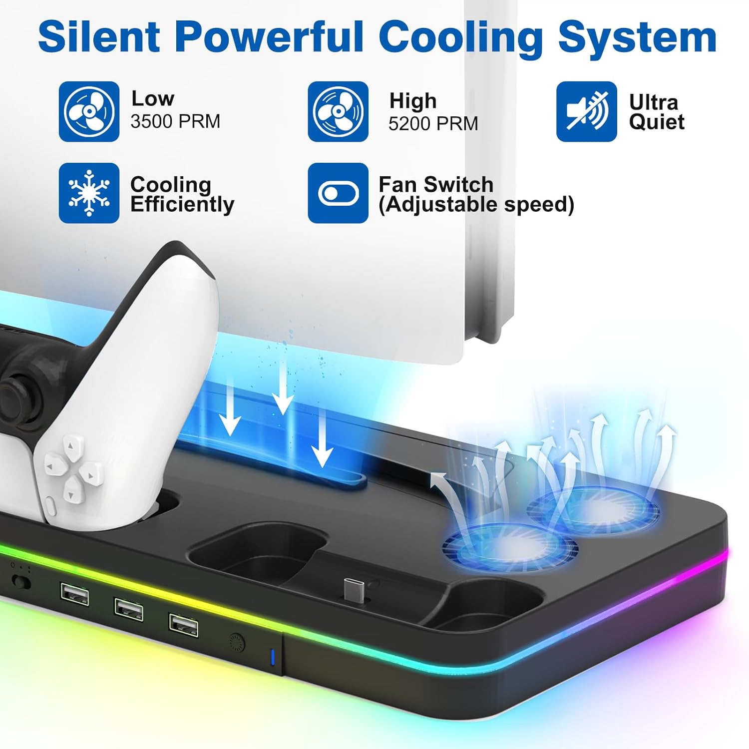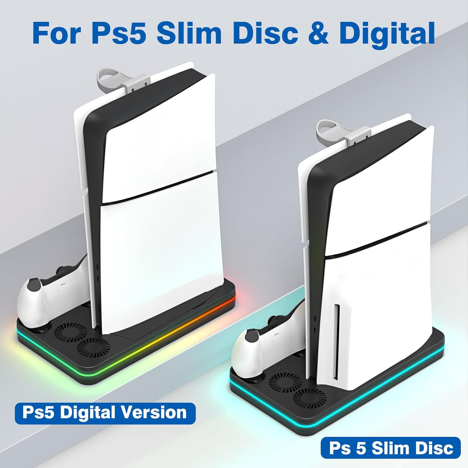 【Suporte de console fino 2023 Ps 5】Estação de resfriamento compatível com o console Newst Ps 5Slim 2023. Possui 2 ventiladores de refrigeração eficientes e estação de carregamento do controlador ps5Slim, luz LED RGB, suporte para fone de ouvido, 3 portas USB extras. Pode atender a todas as suas necessidades: resfriamento do console, carregamento do controlador, atmosfera de luz deslumbrante, transferência de dados ultrarrápida de 5 Gbps, armazenamento de acessórios para jogos PS 5 Silm.