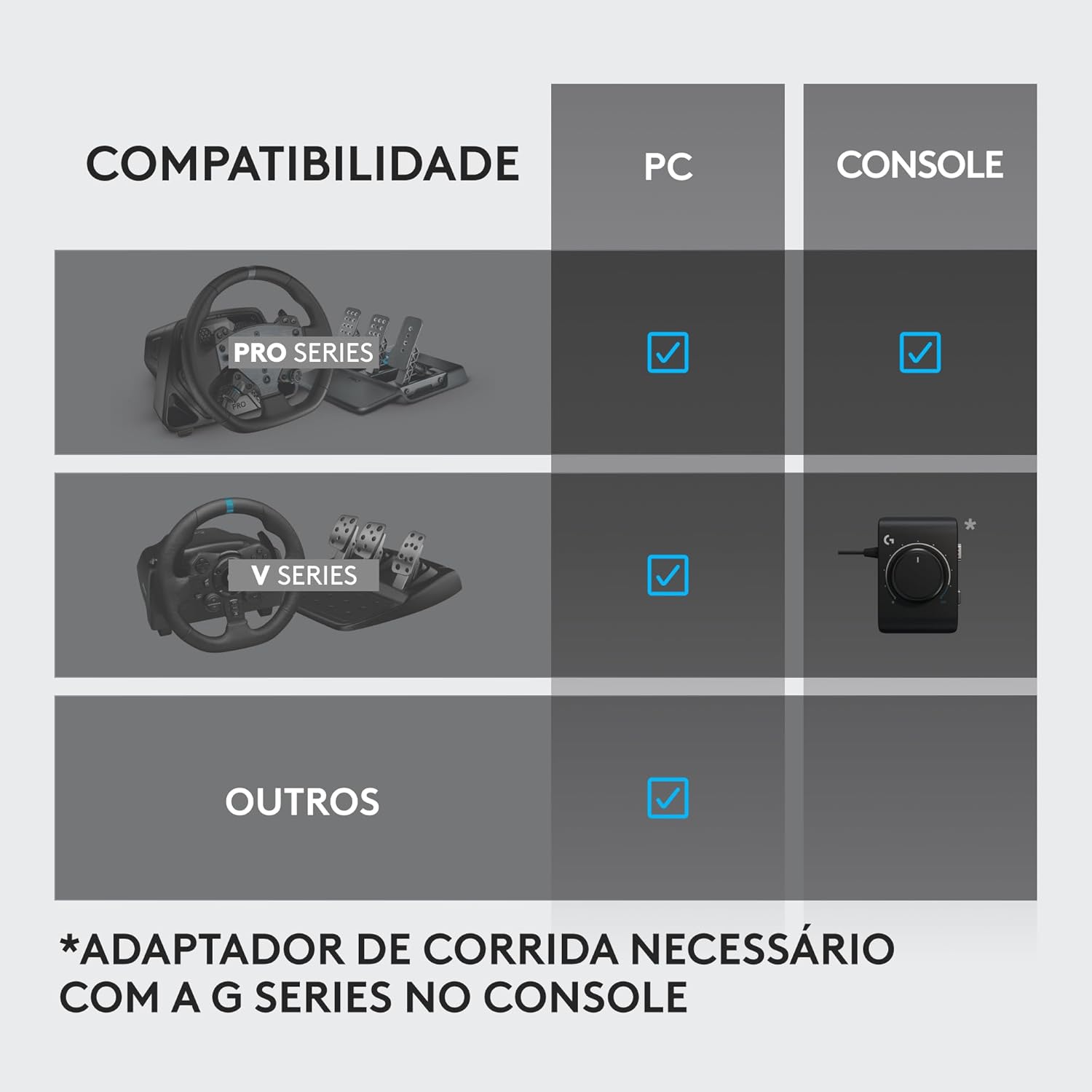 O Adaptador para volantes Racing Adapter permite que você conecte o RS Shifter & Handbrake ao seu G29, G920 ou G923; verifique a tabela para compatibilidade de jogos no console nesta configuração