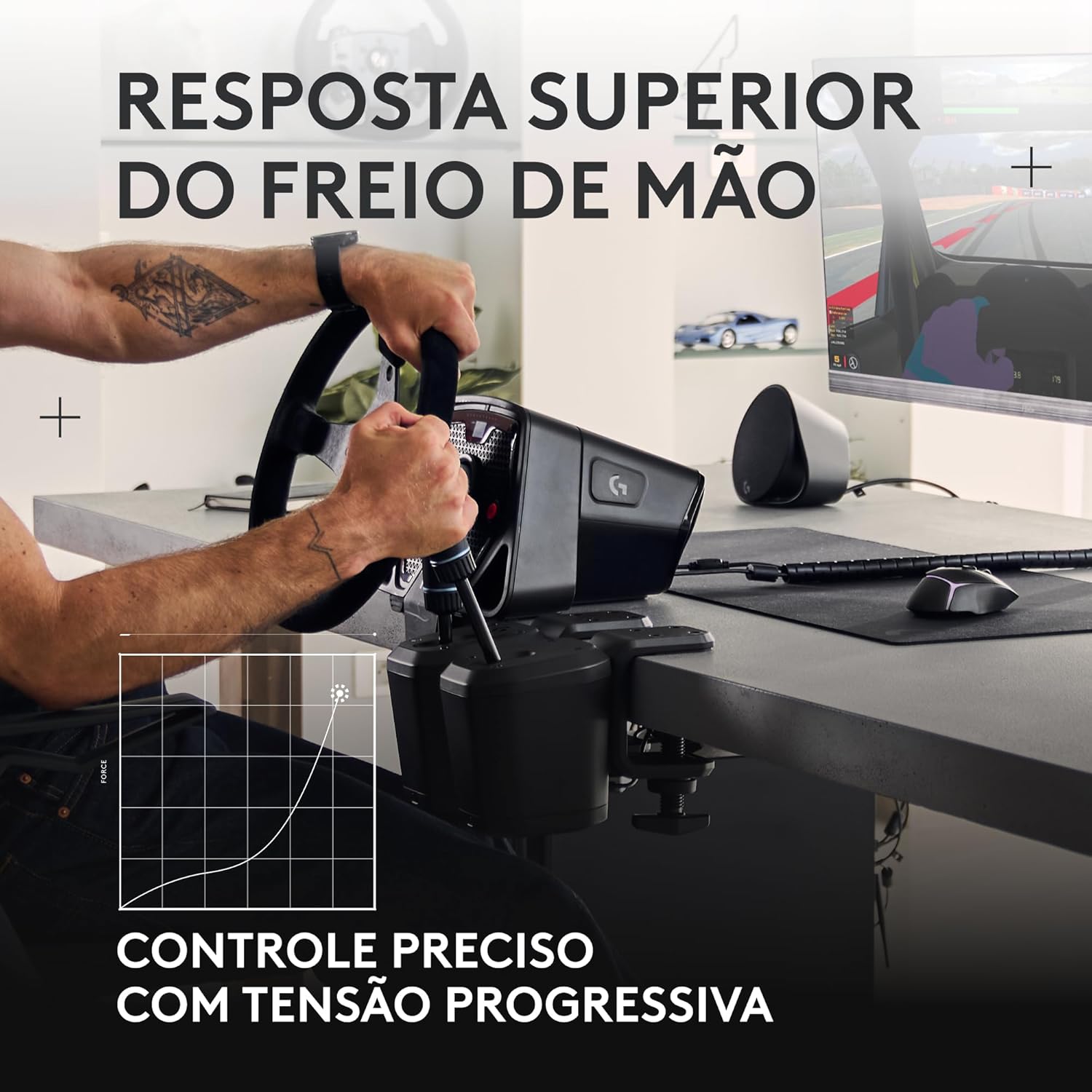 Opções ajustáveis: Ajuste o ponto de atuação do câmbio sequencial e a curva de resposta do freio de mão no software G HUB para encontrar suas configurações preferidas