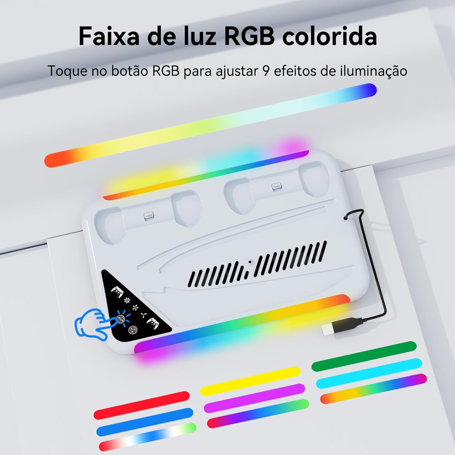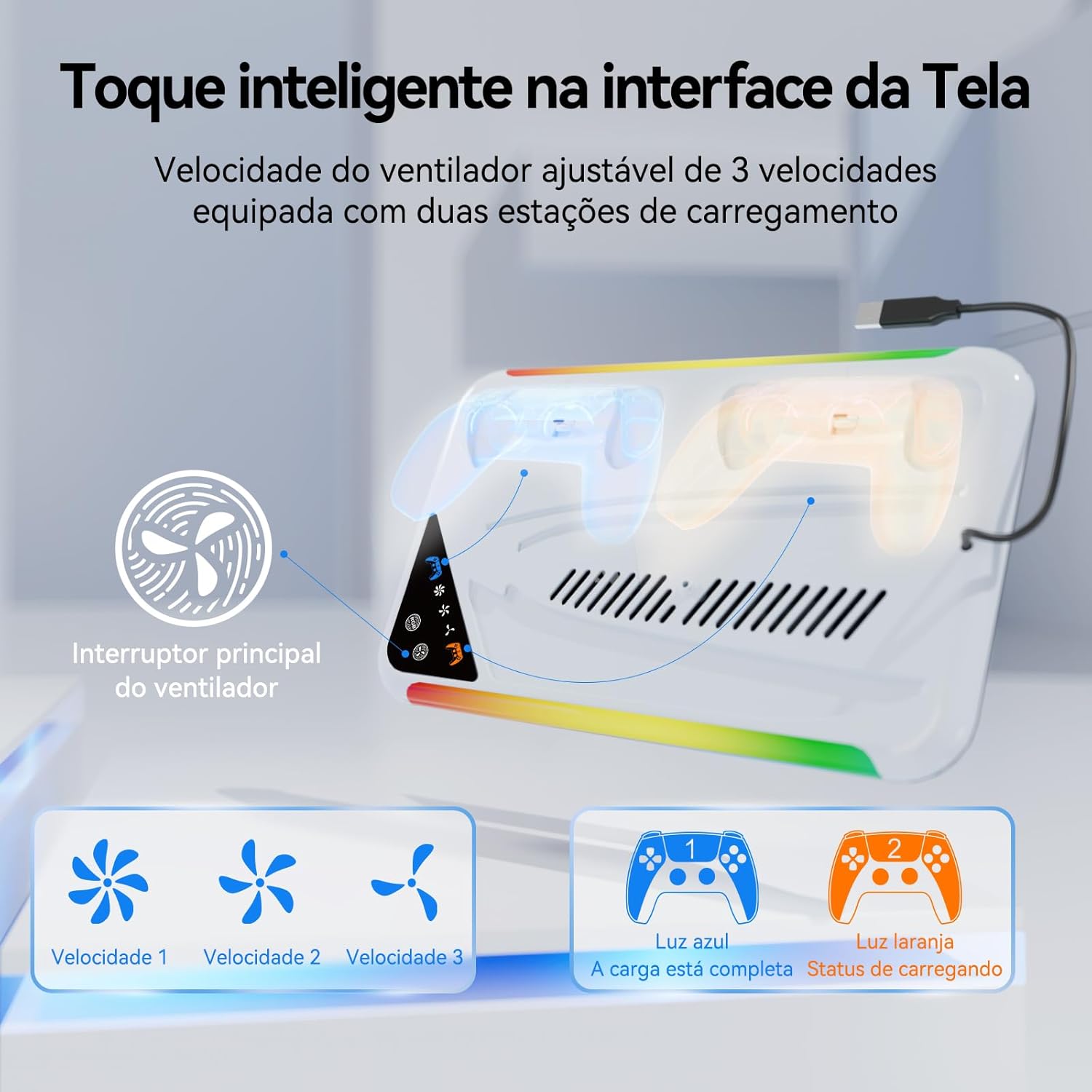 A estação de resfriamento do ps5 tem um anel de LEDs incríveis com modos de luz para um total de 10 cores RGB vibrantes para aprimorar sua configuração de jogos. Pressione longamente para desligar as luzes, se desejar. O suporte para ps5 também possui 3 portas de hub USB para alimentar dispositivos adicionais.