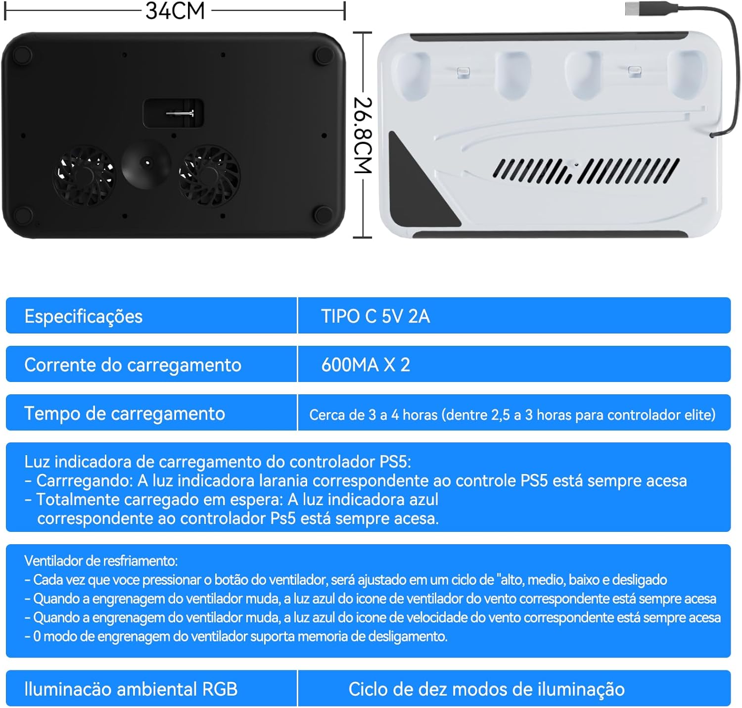Carregue totalmente dois controles PS5 DualSense simultaneamente em apenas três horas. O indicador LED mostrará claramente o status de carga de 2 controles PS5. Vermelho significa que está carregando, azul significa que está em espera ou totalmente carregado. A estação de resfriamento ps5 slim tem proteção contra sobrecarga, sobrecorrente, sobretensão e superaquecimento para garantir que os controladores PS5 sejam carregados com segurança.