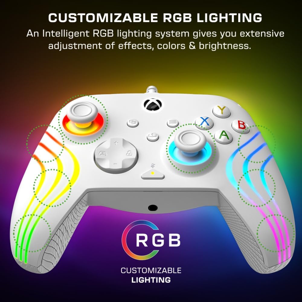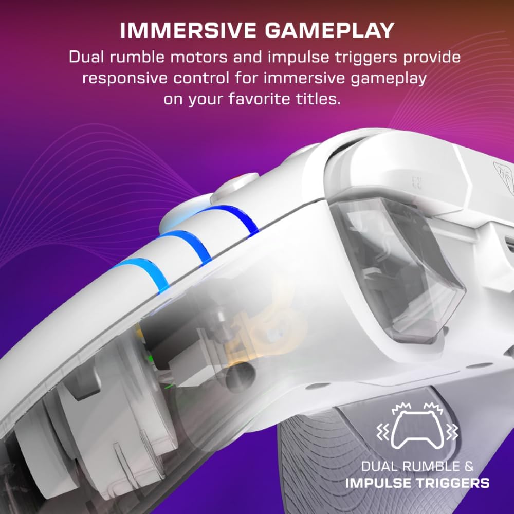 Desbloqueie alto desempenho e estilo de jogos com o controle de jogos RGB Turtle Beach Afterglow Wave, oficialmente licenciado para Xbox e PC. Os gatilhos de impulso ajustáveis de 3 paradas Hall-Effect oferecem controle suave, duradouro e ajustável, e os motores duplos de ronco proporcionam maior imersão nos jogos. Personalize o estilo e os controles do seu Afterglow Wave com iluminação RGB inteligente e dois botões de ação rápida mapeáveis. Fique preso com áudio patenteado para mixagem de volume de jogo/chat, volume mestre e mudo do microfone. Baixe o aplicativo complementar Control Hub para consoles Xbox e PCs com Windows, oferecendo opções avançadas de personalização para iluminação, mapeamento de botões, bem como configuração e diagnóstico do controle.