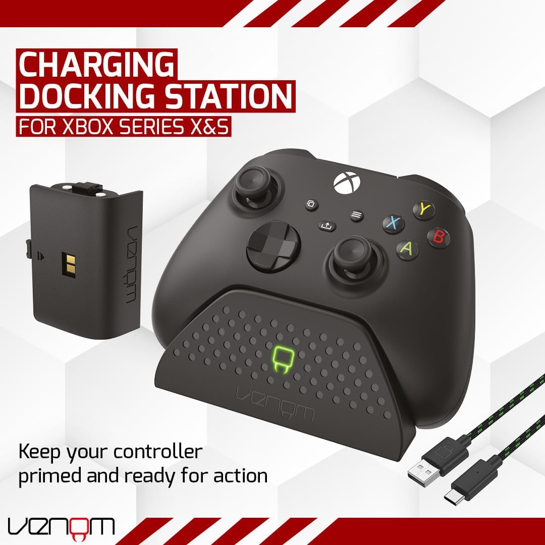 Encaixe, armazene e carregue seu controle Xbox e garanta que seu game pad esteja pronto para jogar assim que você estiver. Inclui uma bateria recarregável de 850 mAh que simplesmente se encaixa no seu controle, eliminando a necessidade de gastar dinheiro constantemente em baterias descartáveis caras. Uma vez no lugar, basta colocar o controle na elegante base de carregamento e os contatos traseiros inovadores se conectarão aos pontos de carregamento automaticamente para reabastecer a energia do seu controle. Com energia total restaurada em cerca de uma hora e oferecendo aproximadamente 15 horas de jogo com uma carga completa, a base também manterá seus controles carregando quando no modo de espera. Esteticamente projetado para combinar com o seu console Xbox Series x, o dock possui um visor LED frontal que ilumina vermelho ao carregar e fica verde quando o controle está totalmente carregado. A base também vem completa com um cabo USB destacável 2M tipo C para dar a você maior flexibilidade de onde você deseja colocar seu carregador. Basta conectar o cabo USB ao dock e a qualquer saída de alimentação USB, como seu console ou um plugue de rede USB padrão, e seu dock estará pronto para carregar. Além disso, todos sabemos como as portas USB podem ser preciosas, além de podermos encaixar e carregar seu controle, adicionamos uma porta de saída USB extra na parte traseira do dock que permitirá que você se conecte a outros dispositivos carregados por USB.