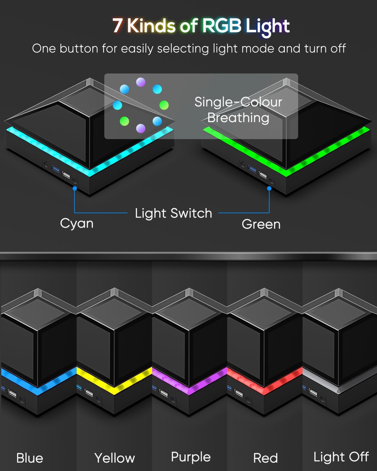 O ventilador de refrigeração com 1 efeito de luz intermitente, 6 efeitos de luz de cor única diferentes. Ajuste independente do interruptor de toque. A luz RGB cria uma sensação de atmosfera para jogos Xbox Series X. A capa superior contra poeira é removível.