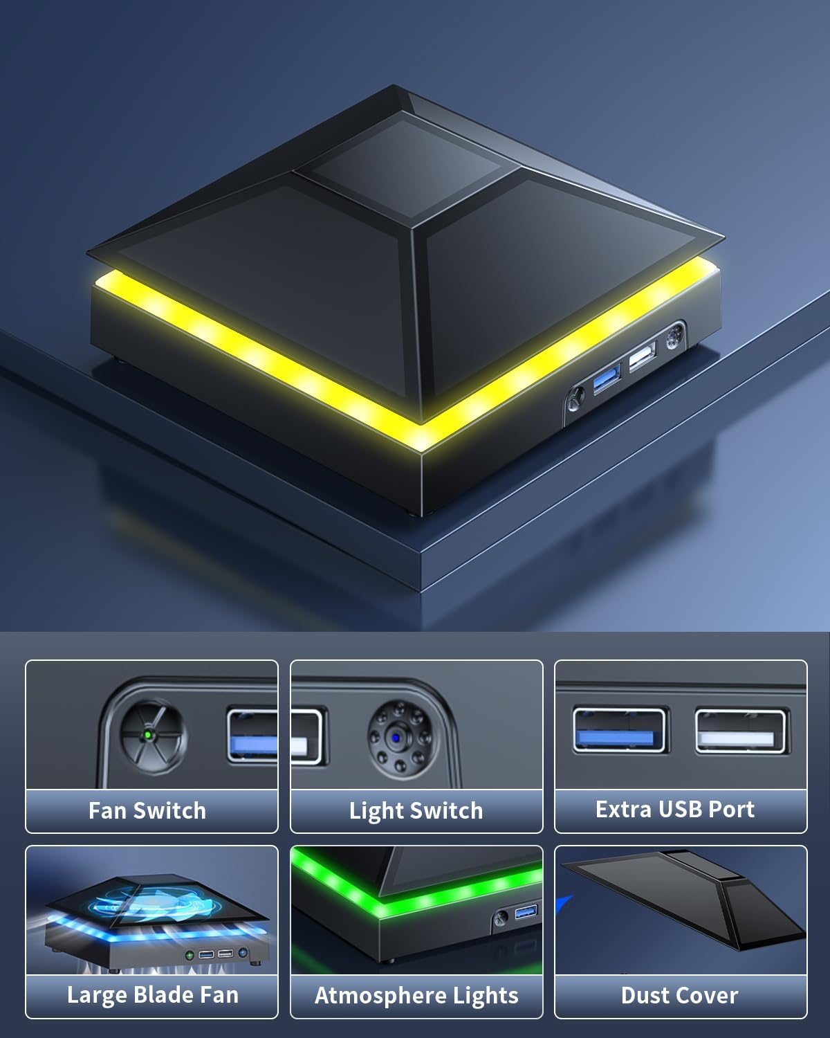 【Sistema de ventoinha eficiente】—- Um ventilador grande de alta velocidade é construído com o ventilador de refrigeração colorido à prova de poeira, que pode acelerar o ar quente exaustão da parte superior do console e reduzir a temperatura do console Xbox Series X. O ventilador de refrigeração tem 3 engrenagens e é um interruptor de toque. A baixa marcha é laranja, a segunda marcha é azul e a alta engrenagem é verde. O efeito de dissipação de calor é mais óbvio e o ruído é muito baixo, o que você dificilmente pode sentir.
