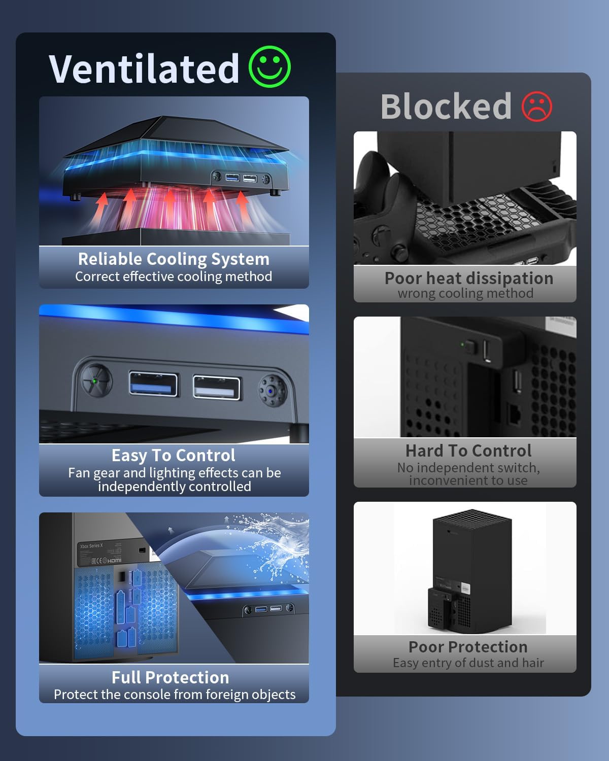 【Necessário para Xbox Series X】—- Este produto integra muitas funções, como ventilador de refrigeração superior, à prova de poeira, faixa de luz colorida, interface USB para transmissão de dados e interface USB para carregamento. Isso ajuda a evitar o superaquecimento do seu console Xbox Series X e prolongue a vida útil do seu Xbox Series. Ao mesmo tempo, a luz colorida aumenta a atmosfera dos jogos.
